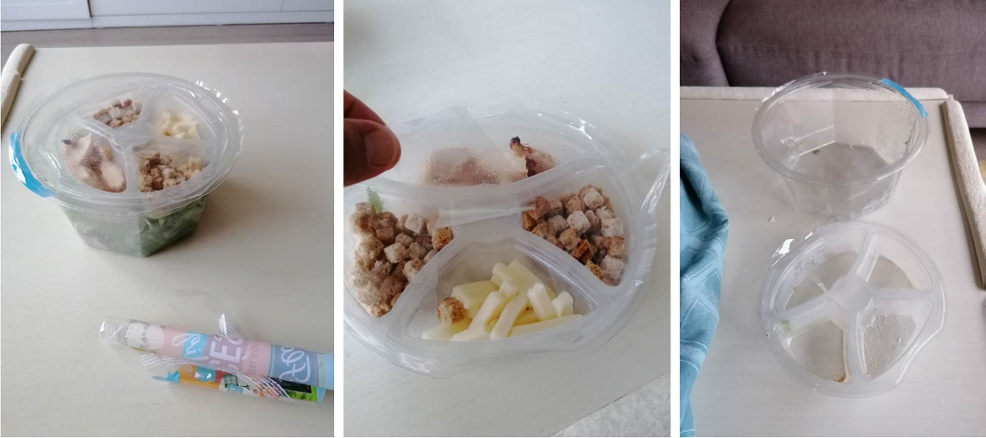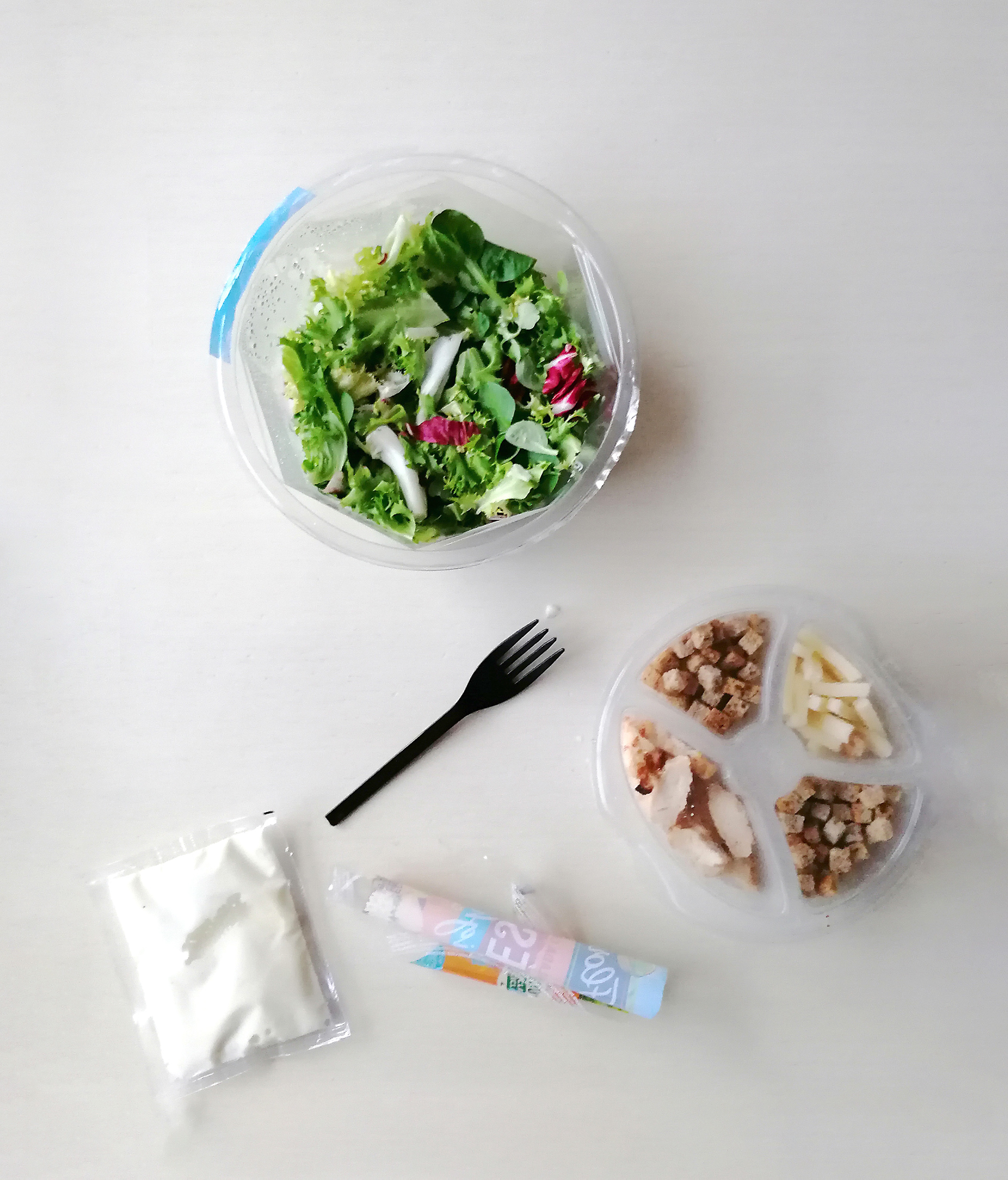 Bol de plástico: lechuga, bolsa de plástico con salsa y tenedor de plástico.