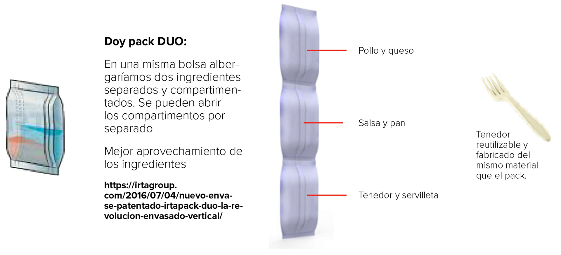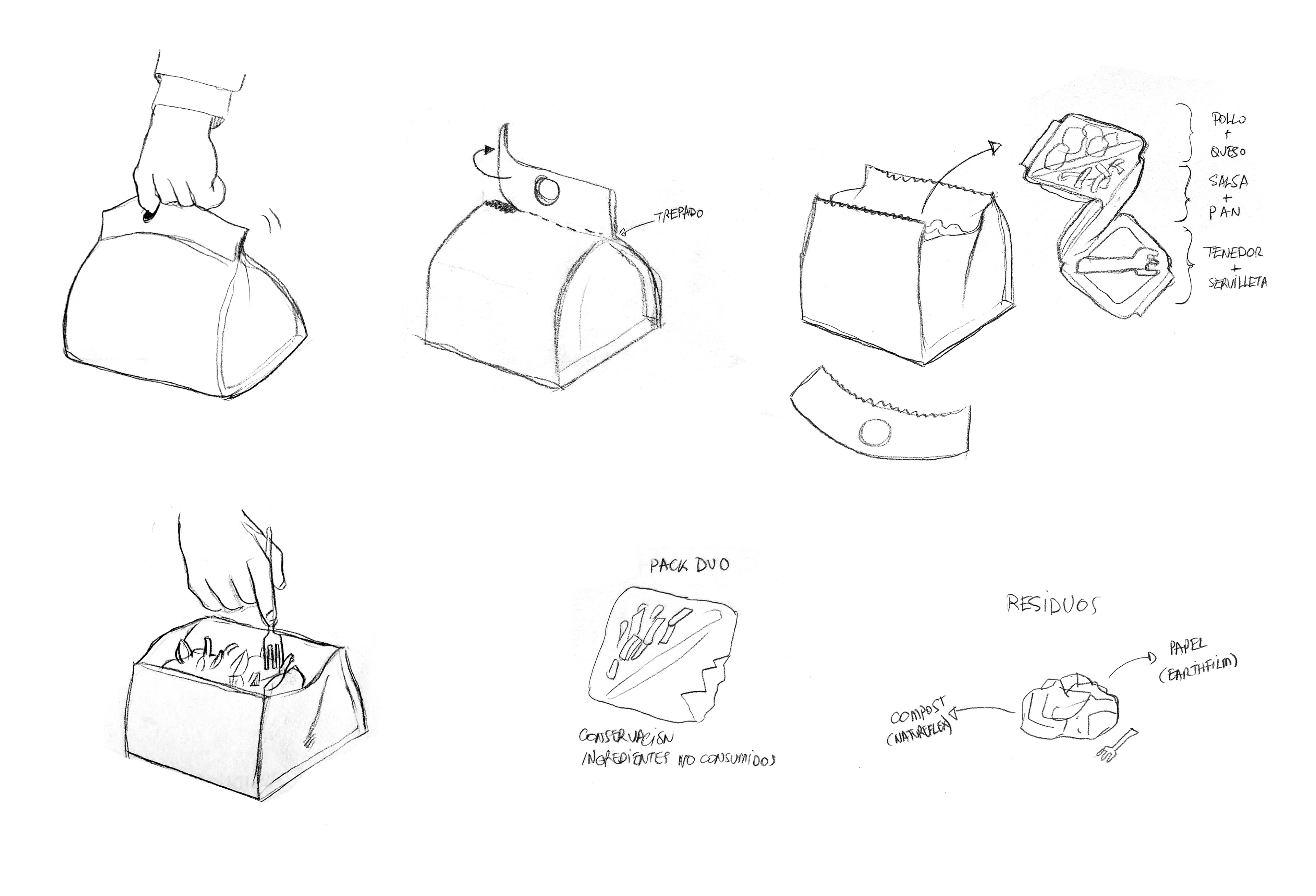 La idea es que el consumidor corte la parte superior gracias a un trepado, quedando la bolsa abierta en forma de bol cuadrado. Dentro encontraría los minipacks con los ingredientes. Los minipacks interiores irían unidos en ristra a través del termosellado. Serían 3 packs, donde dos de ellos serían DUO: tenedor + servilleta, salsa+pan, pollo+queso.