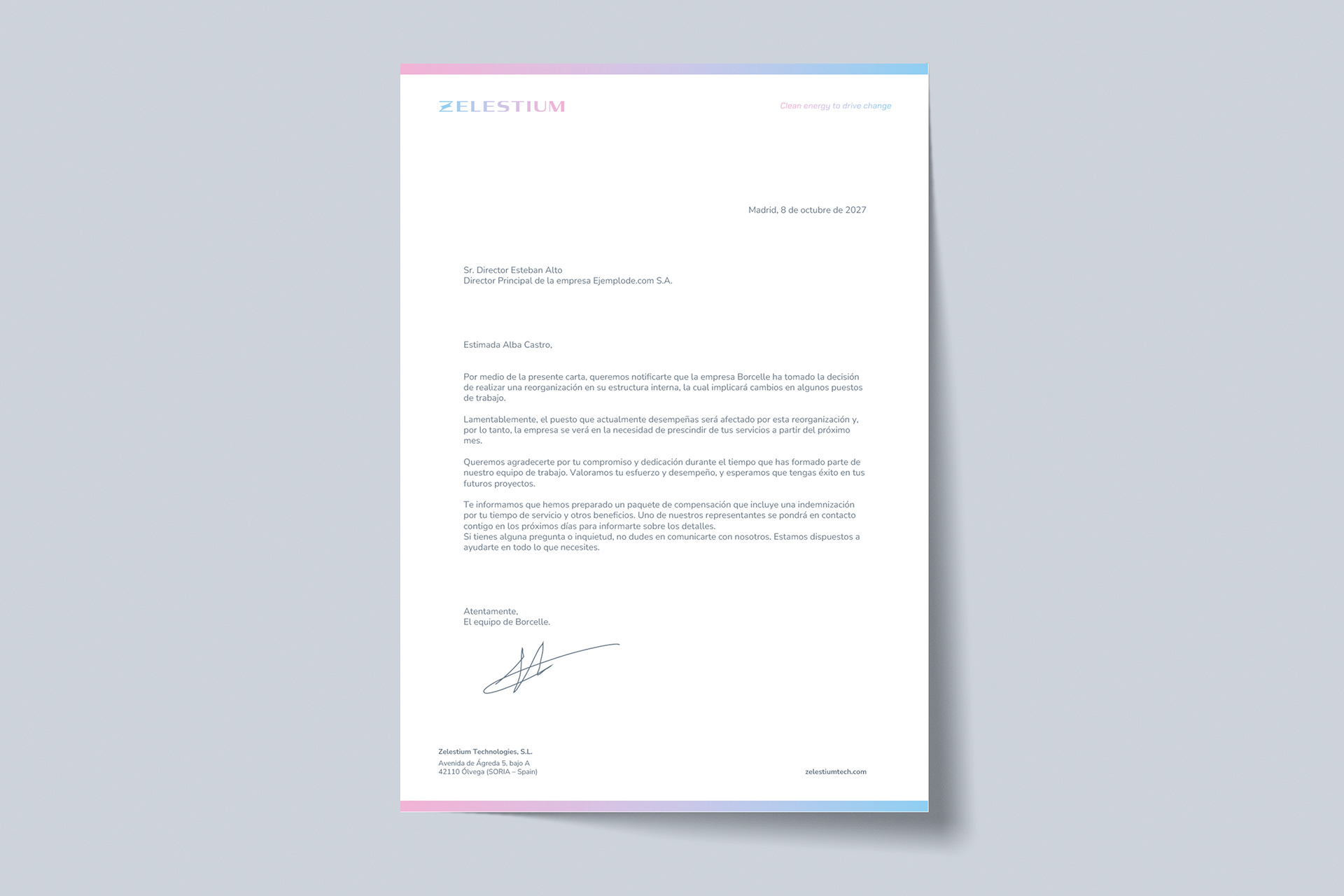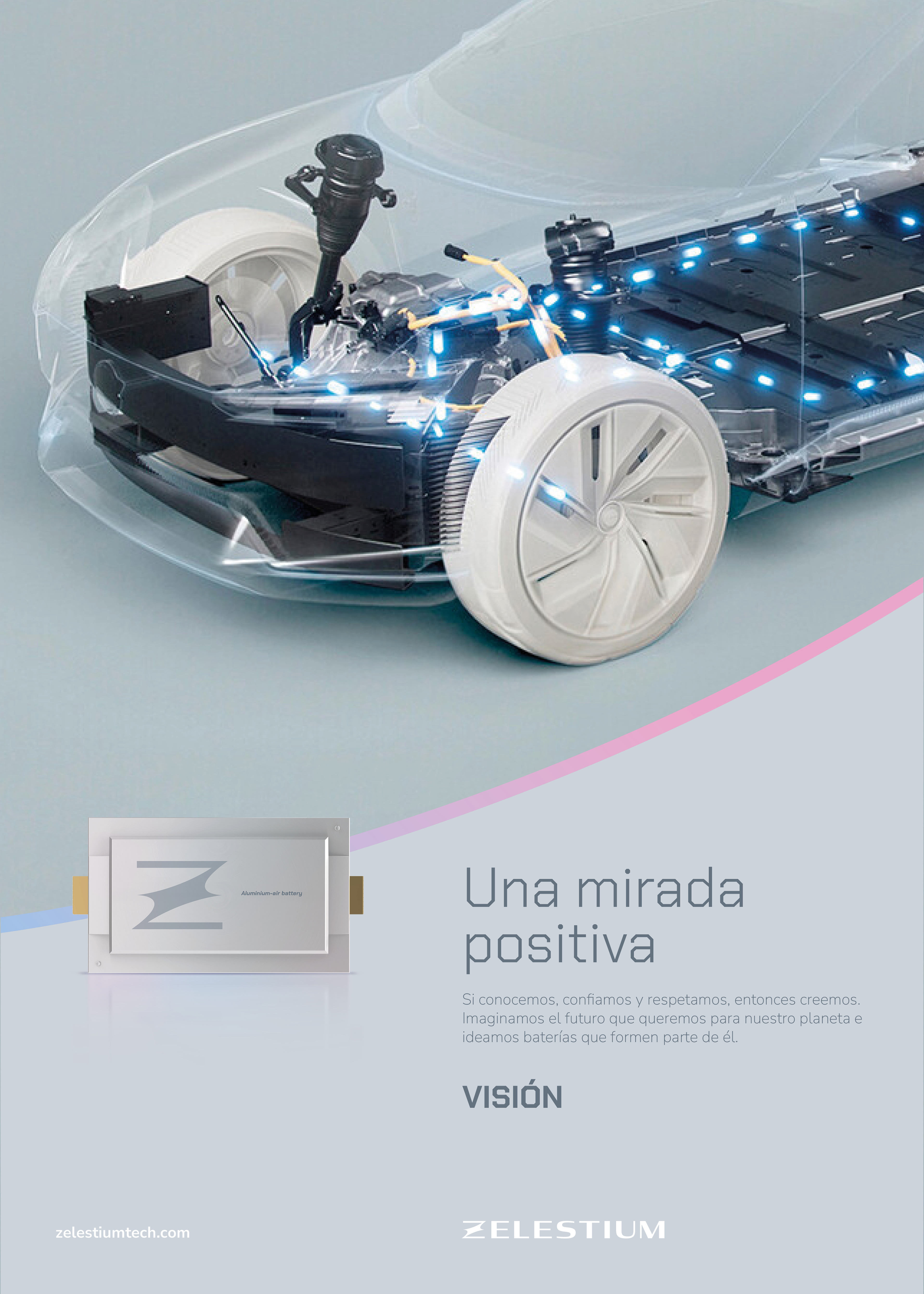 La paleta de Zelestium transmite energía, dinamismo y sostenibilidad, reflejando la unión entre ciencia y tecnología. Su uso, tanto en degradados como en plano, aporta un carácter expansivo. La jerarquía cromática parte de grises fríos y evoluciona hacia azules, fucsias y una gama más amplia para aplicaciones específicas..